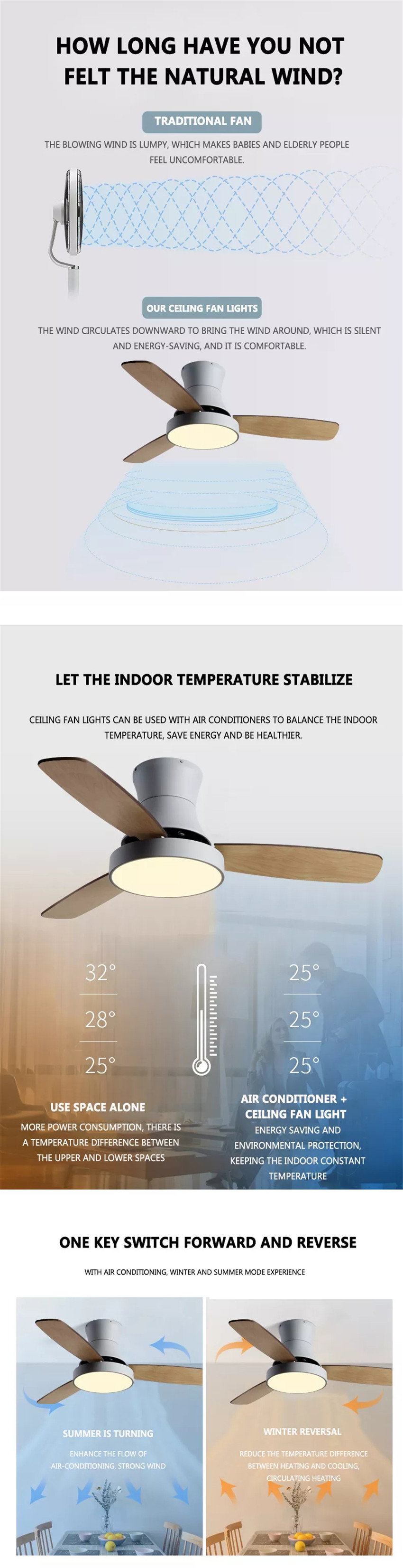 DC Quiet Motor:The ceiling fans with remote and light has silicon steel pure copper reversible DC motor, DC motor makes 75% more energy efficient than traditional AC motor. The reversible function allows you cool down in the summer and keep the room warm in the winter. Has the advantages of high efficiency, low temperature, noiseless.