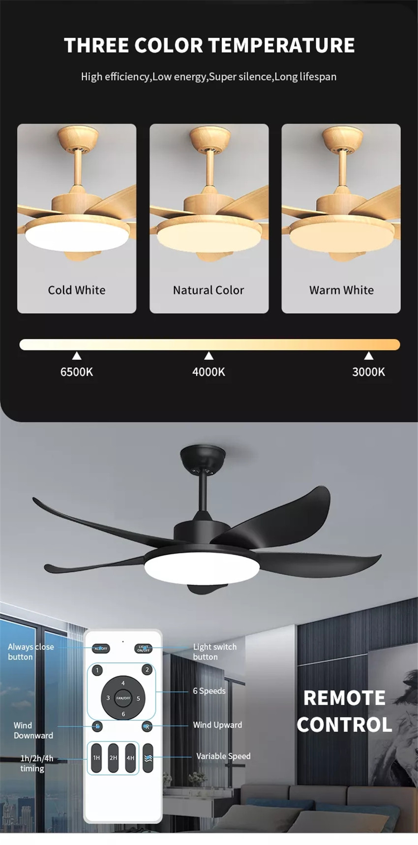 Multifunctional Quiet Fan:This quiet ceiling fan with remote control has 6 speeds and timers setting. Using high quality DC motor drive makes the fan very quiet at any working setting without disturbing sleep and study.