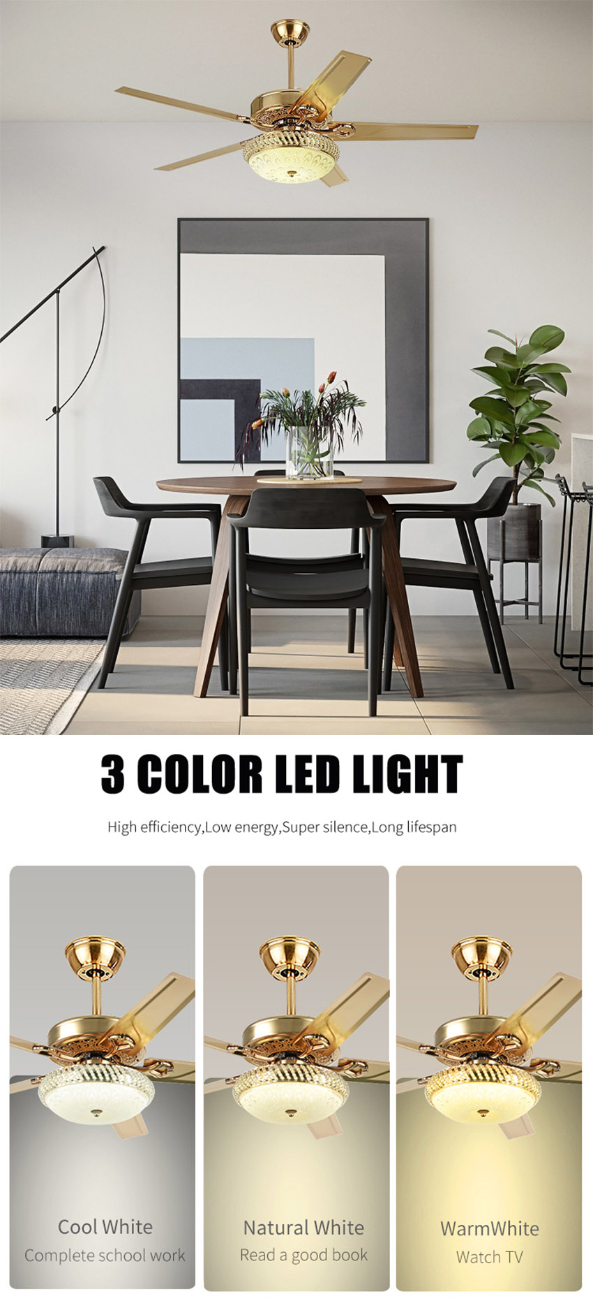 Universal handheld remote: Remote control of dimming and wind speed, LED lights(Cool-Neutral-Warm), wind speed (Low-Mid-High). The remote control switch avoids the additional arrangement of the wall switch line, and the installation is convenient.