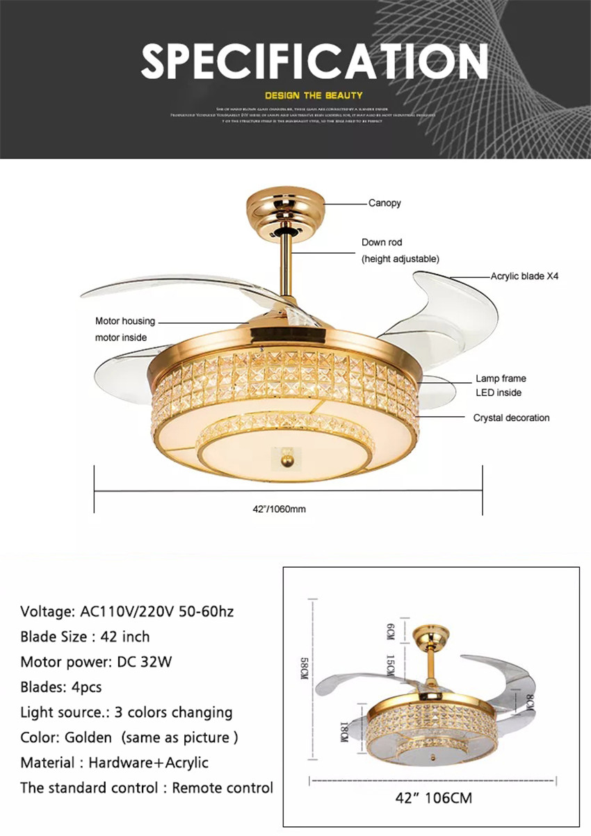 Exquisite Crystal Embellishments: The durable metal lampshade of our ceiling fan is meticulously adorned with high-grade K9 crystal material.