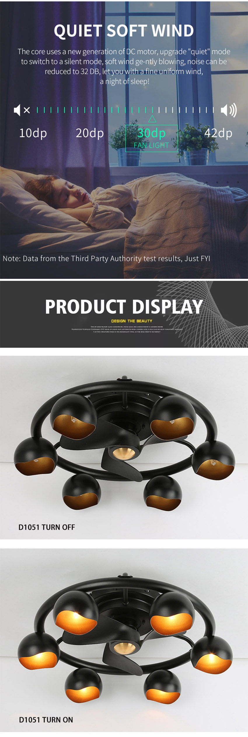 DC Powerful Motor: Built-in DC bearing copper core motor, provides strong and stable wind. Silent operation is lower than 35db. And it's energy saving, 20-30% electricity less consumed than traditional AC ceiling fans.
